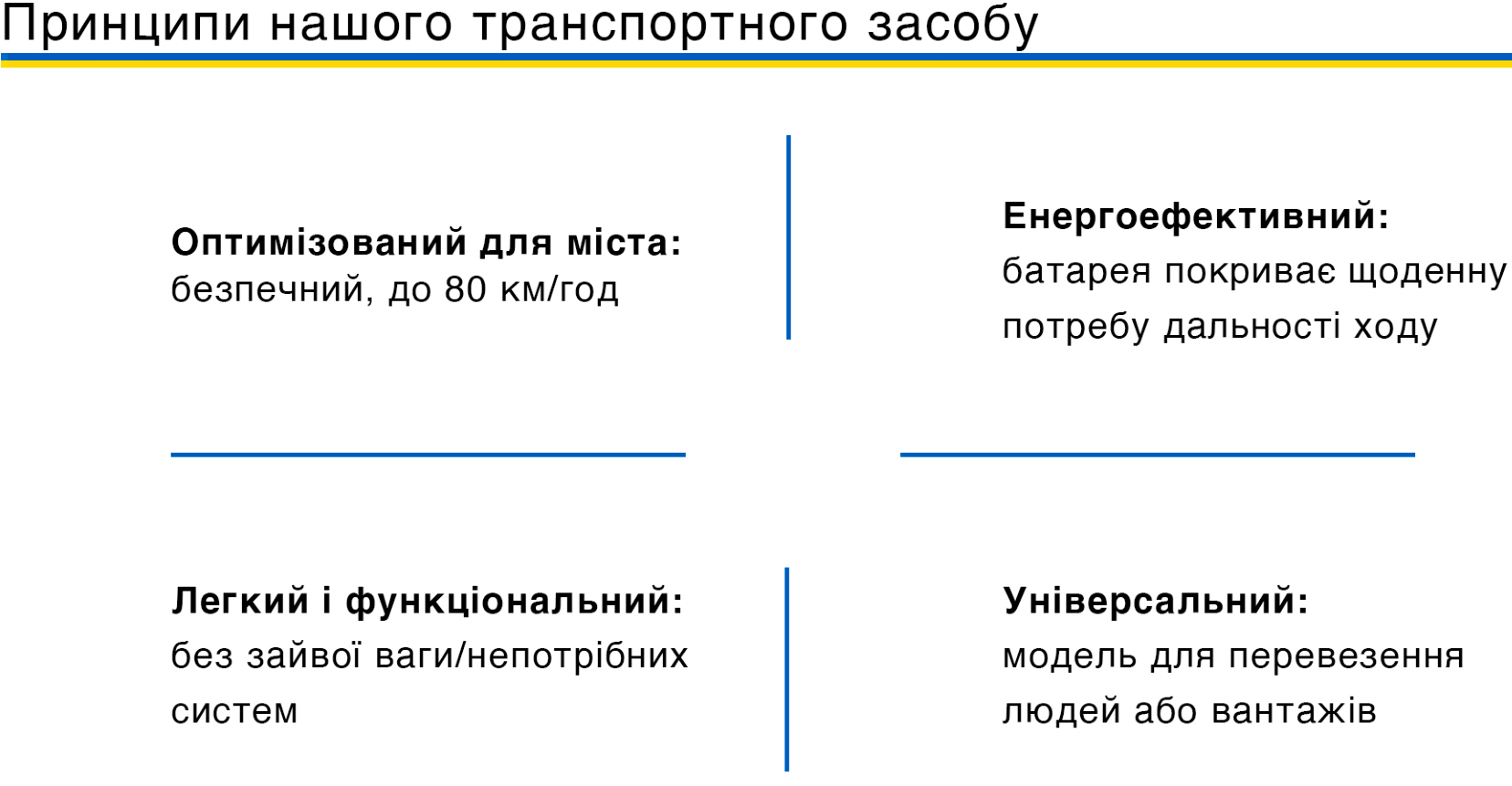 Ми плануємо серійне виробництво до 50 000 авто на рік з фокусом на ринки Європейського Союзу. Водночас проєкт має чітку соціальну місію: з кожних 14 проданих у ЄС автомобілів один буде виготовлений і переданий безкоштовно людям у кріслах колісних або ветеранам в Україні, які прагнуть працювати, вести бізнес і бути активною частиною суспільства.